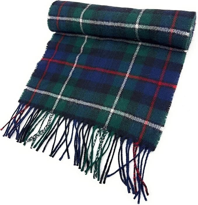 Wrap yourself in authentic Scottish luxury with this exquisite MacKenzie tartan scarf. Crafted from pure lambswool in Scotland, this traditional accessory features the distinctive MacKenzie clan pattern in rich navy blue and forest green, accented with striking red and white lines. The classic tartan design is woven with meticulous attention to detail, creating a timeless piece that connects to Scottish heritage. The scarf's generous dimensions and soft, warm lambswool construction make it perfect for chilly weather, while the carefully crafted fringed ends add a traditional finishing touch. The versatile unisex design pairs beautifully with both casual and formal attire, making it an excellent choice for any occasion. The wool's natural properties provide remarkable warmth and comfort, while the classic pattern remains a symbol of Scottish craftsmanship. Whether worn draped, wrapped, or folded, this authentic MacKenzie tartan scarf adds a distinguished touch to your winter wardrobe while keeping you cosy throughout the cold season.